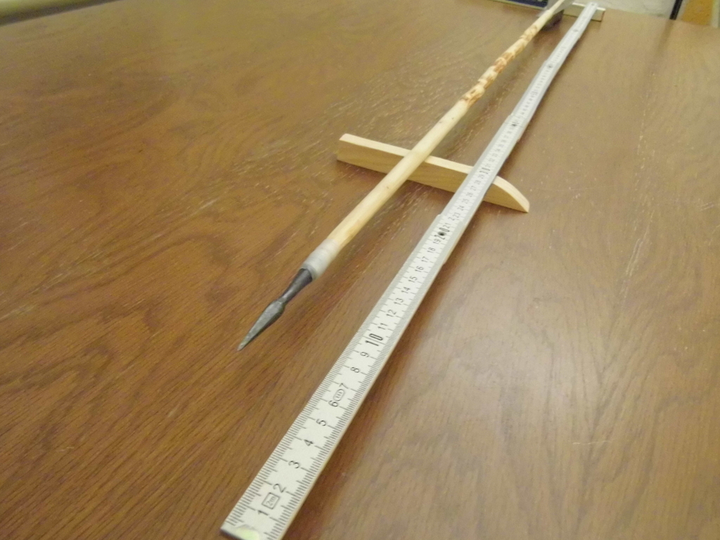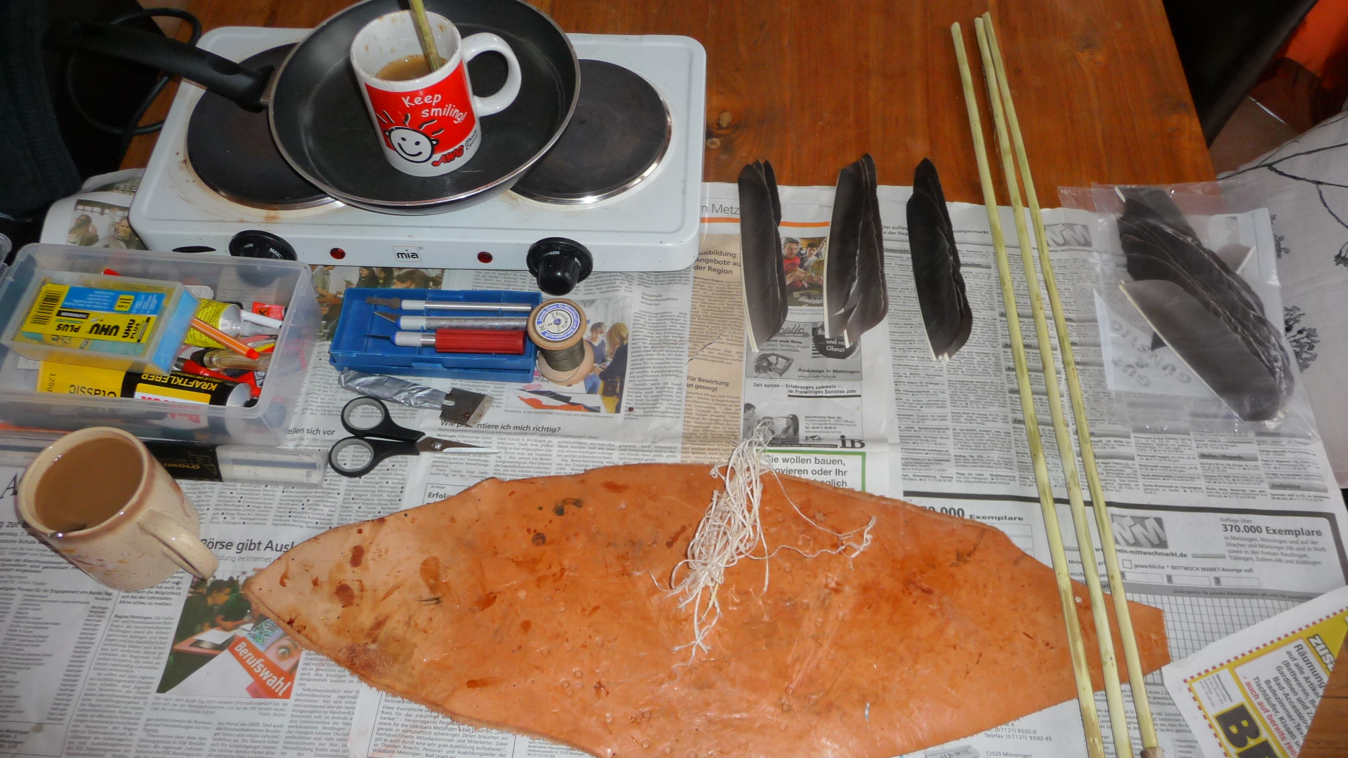 Die Schäfte wurden gestern noch mit den Spitzen und Federn versehen. Für die Federn hab ich modernen Pattex genommen, für die Hornspitze Birkenpech (Hab ich iwann mal gemacht und gammelte bis jetzt unbenutzt in der Garage...)