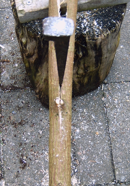 * Du schlägst den (oder bei dicken Stämmen: die ersten 2 - 3) von der STIRNSEITE her ein! NICHT ganz am Rand, einen Einzelnen genau in die Mitte (mittig in den Markkanal), 2 Keile links und rechts vom Markkanal mit etwa 1 Hammerbreite Abstand.