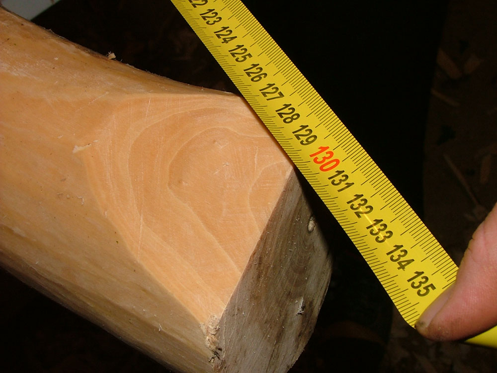 Als erstes habe ich die Wurfarmbreite durchgehend mit 5cm eingezeichnet. Natürlich dem Verlauf des Stammes folgend, daraus ergibt sich ein seitlicher Knick im Griff der später korrigiert wird. Und dann bab ich mit dem Zugschwert ( ;D ) meines Vaters losgelegt.