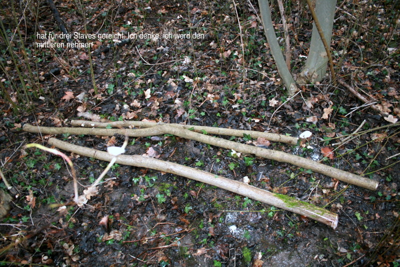 Ganz wollte ich die Idee des Hohenaschu Nachbaus aber doch nicht aufgeben, als zurück in den Wald. Ich hab da gestern einen Goldregenstamm gesehen der 12 cm Durchmesser hatte nur war der kurz und krumm. Dachmessen vor Ort hat eine verwertbare Länge von 90 cm gezeigt und eine Krümmung in eine Richtung