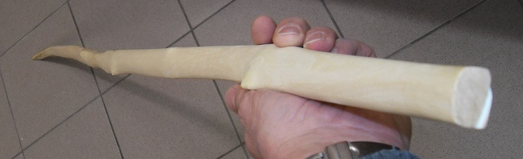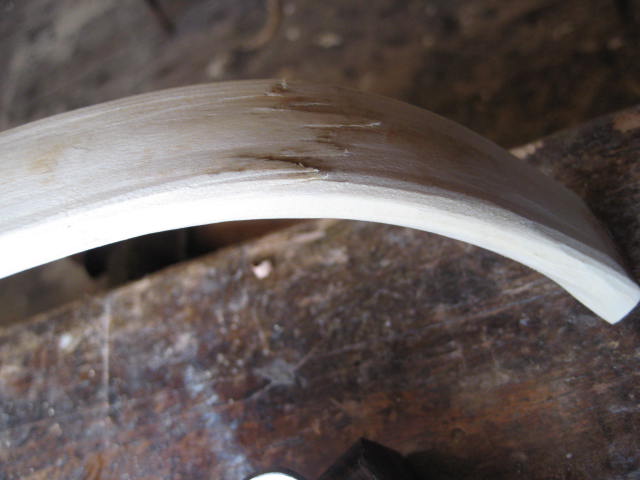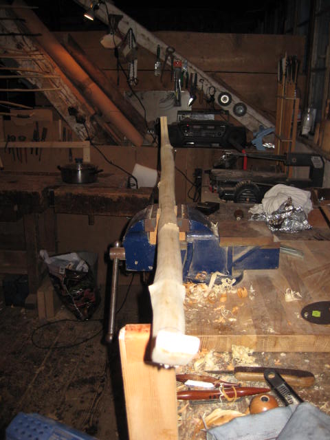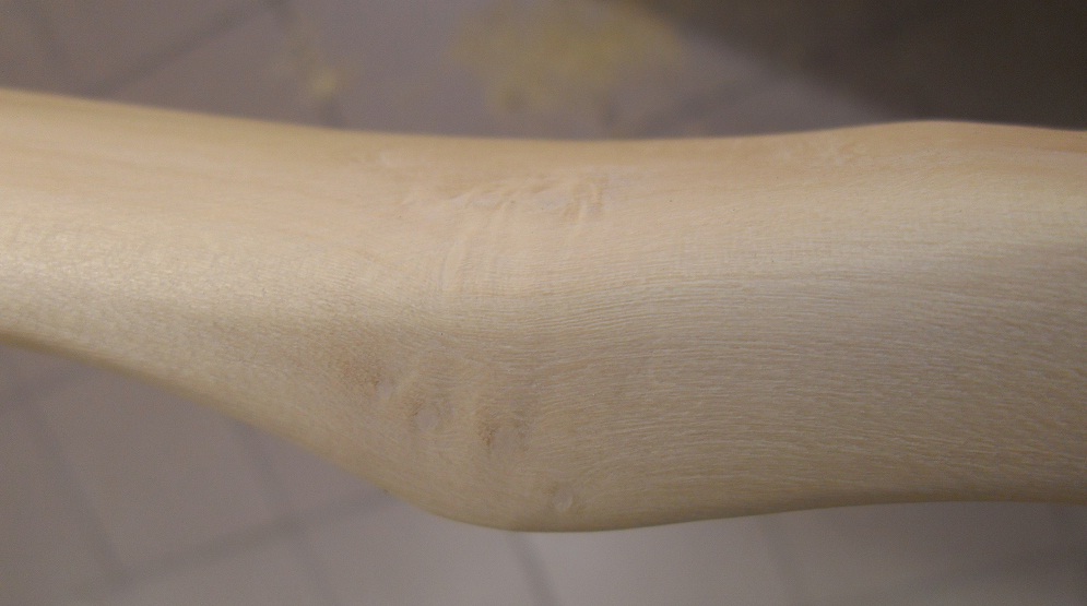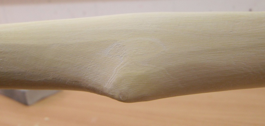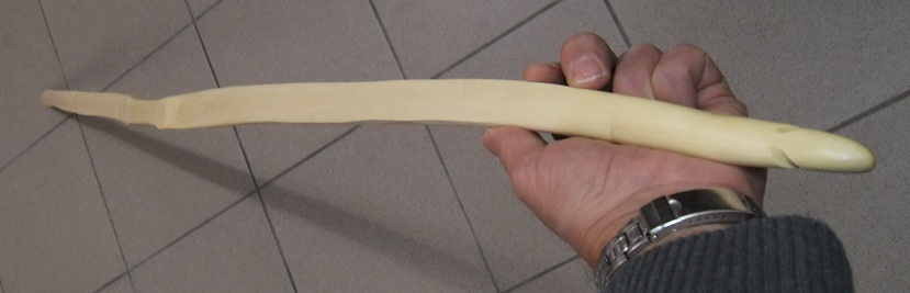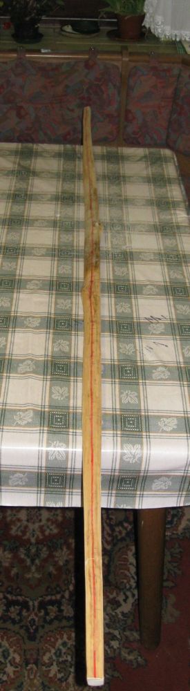Heute den Eibensapling mit der Bandsäge erst einmal in Form gebrachtund festgestellt, dass er doch einen g a n z leichten Knick hatder glücklicherweise ziemlich genau im Griffbereich liegt.