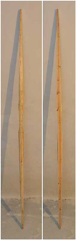 Ich wollte einfach ausprobieren, ob mein Kindheitsbogen (Stecken aus Holler mit ca. 10 lb) auch in höheren Zuggewichten machbar ist. Also den Holundersapling ohne Schnitzarbeit verwendet (der runde Ast mit Markkanal in der Mitte), nur ein wenig abgetragen zum Tillern und die beiden dickeren Enden zusammengespleißt.