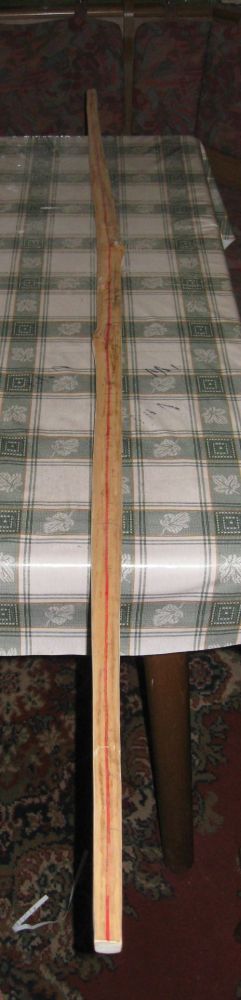 Heute den Eibensapling mit der Bandsäge erst einmal in Form gebrachtund festgestellt, dass er doch einen g a n z leichten Knick hatder glücklicherweise ziemlich genau im Griffbereich liegt.