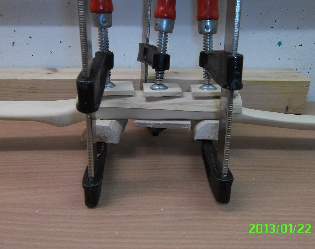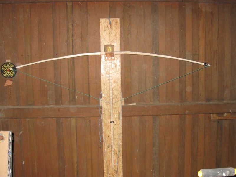 Ich habe noch bis ca. 25" getillert und dann mir eine Vorrichtung gebaut (eher geschnürt ;D ), um den Stab, der langsam zum Bogen wird auf Standhöhe zu bringen. (Um Chirions Luxusausführung nachzubauen war ich dann doch zu ungeduldig ;) )