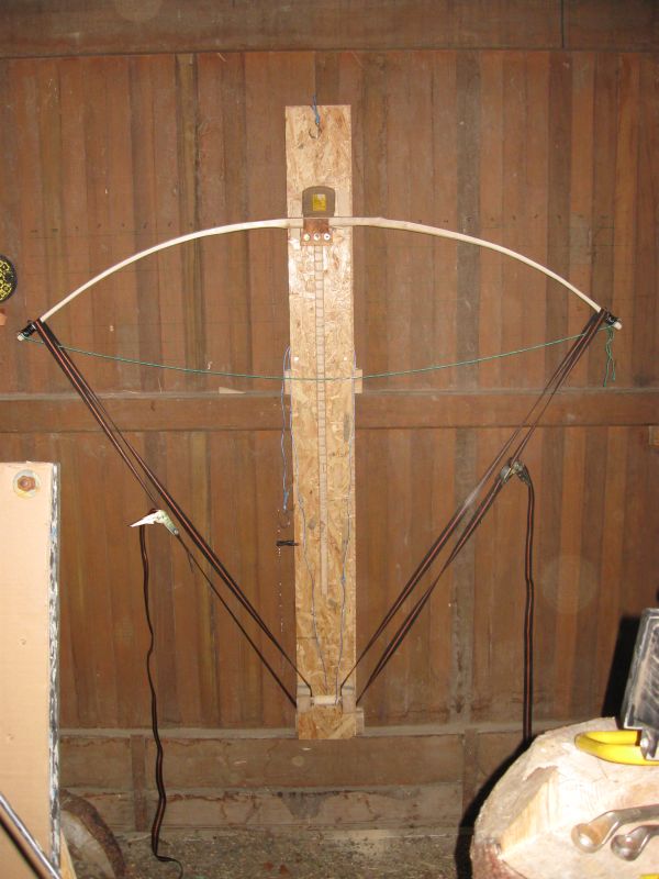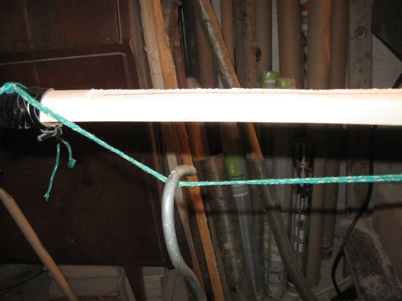Ich habe noch bis ca. 25" getillert und dann mir eine Vorrichtung gebaut (eher geschnürt ;D ), um den Stab, der langsam zum Bogen wird auf Standhöhe zu bringen. (Um Chirions Luxusausführung nachzubauen war ich dann doch zu ungeduldig ;) )