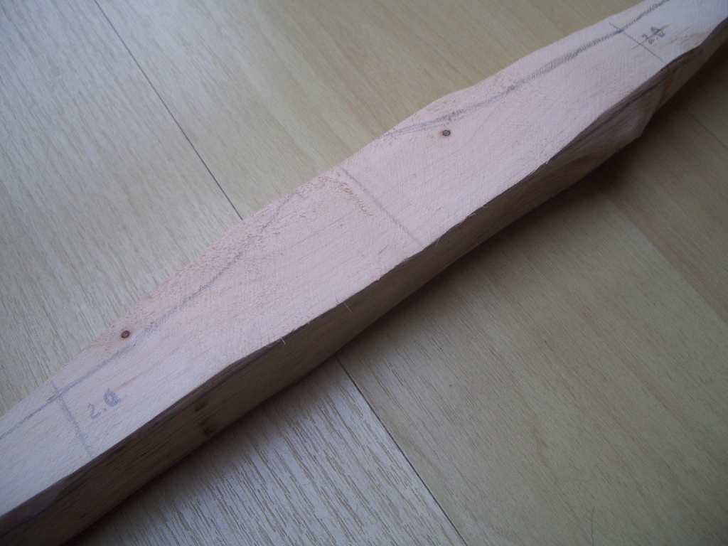 Ich konnte jetzt die Bogenmitte und danach den Breitentaper mit einem Bleistift auf dem Bauch anzeichnen. Ausgemessen hab ich mit einem großen Geodreieck. Das Design ist asymetrisch. Der Griff sitzt 8 cm unter der Mitte. Die Wurfarme sind bis zu ihrer Hälfte jeweils 4 cm breit und verjüngen sich dann pyramidial auf 2,6 cm bei 3/4 und 1,2 cm an den zukünftigen Nocks.