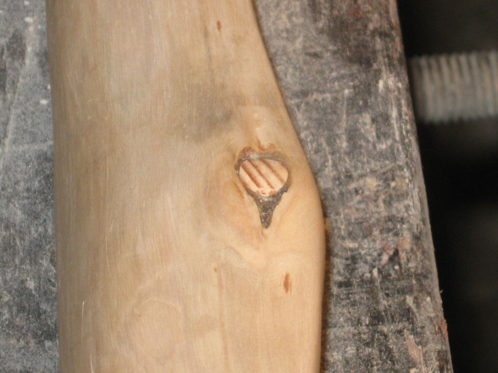 Dann habe ich, da ich kein trockenes Kirschenholz mehr hatte, einen Fichtenrundstab (Reststück eines meiner zerbrochenen Pfeile :D ) eingeklebt,