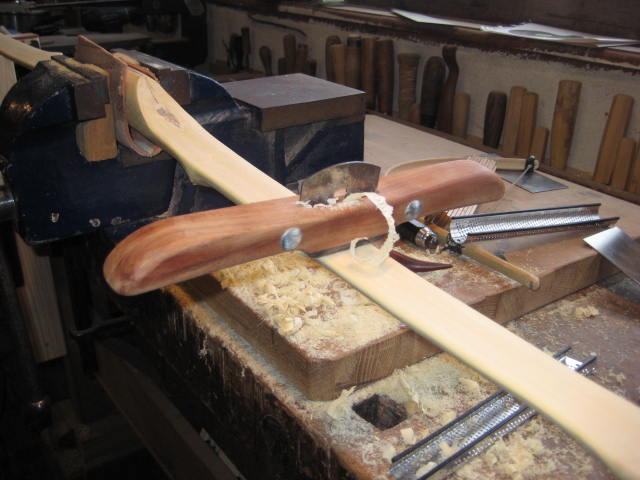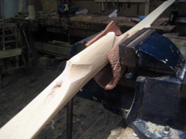 Hier gehts zu meinem ersten Beitrag Der Breitenverlauf des Bogens wird angezeichnet. Die Tips bleiben aber mit 2cm noch breiter als angedacht. Im unteren Teil des Fotos der Griffbereich.