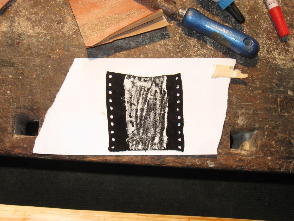 Wie ich´s hier im Forum gelesen habe zeige ich´s hier mal mit Bildern. Da mein Griffstück schön gleichmäßig ist, brauchte ich nur ein einfaches, rechteckiges Leder zuzuschneiden. Dann habe ich 4mm Löcher reingestanzt Das nächste Mal werde ich sie kleiner stanzen, da mein Lederband auch 4mm breit ist und ich sicher gehen wollte, daß da nix knubbelt, aber das seht ihr später.