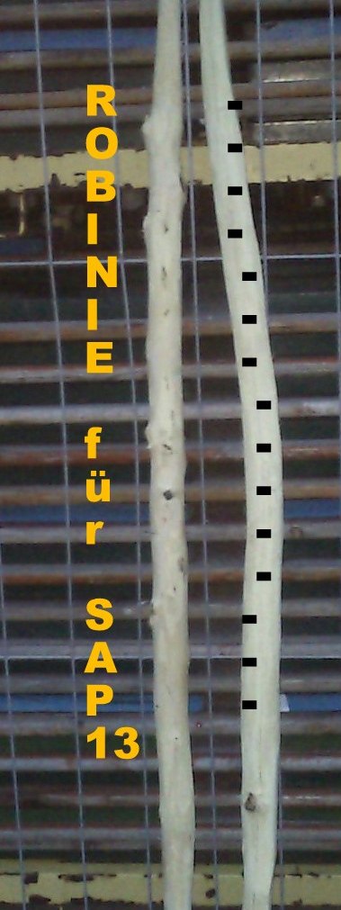 ich hab da noch einen Robinien - Stave, den ich bereit wäre als Preis abzudrücken: Viertelstamm gespalten, 170 cm, gerade, leicht reflex, ziemlich fette Ringe, 3 Jahre getrocknet....