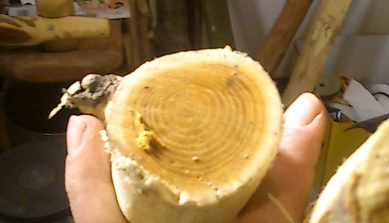 Ich nehm den linken/Die Überraschung kam erst nachdem die Rinde runter war.Nicht so toll gewachsen und an der besseren Seite Totäste/Faulstellen/Nassstellen. Aber Gut, angefangen war er und ich hatte ja noch Holler und Pfaffenhütchen zur Reserve.