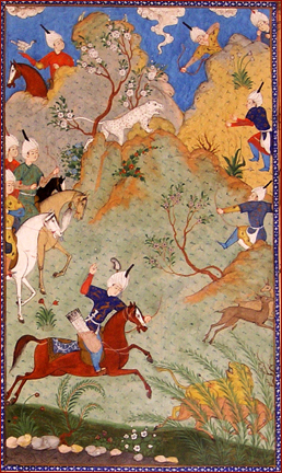 Ich hätte da noch ein Bild, das annähernd unser Problem zeigt: Schütze zu Pferd (ich meine den unteren) im Moment nach dem Release, der Bogen sieht nicht aus, als hätte ein Kippen nach vorne stattgefunden, die Zughand erhoben, ähnlich wie bei Sultan Selim. Interessant ist, dass der Gentleman die Pfeile im Gürtel und nicht im Köcher trägt. Die Haltung der Zughand scheint für das schnelle Nachfassen von Pfeilen eher unpraktisch.