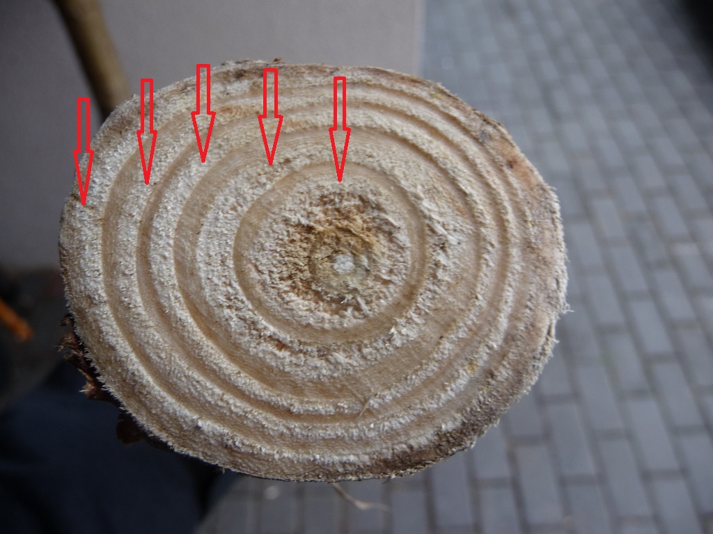 - Sollte diese dunkelbraune Verfärbung unter der Borke auftauchen, ist der Baum nicht zum Bogenbau geeignet.