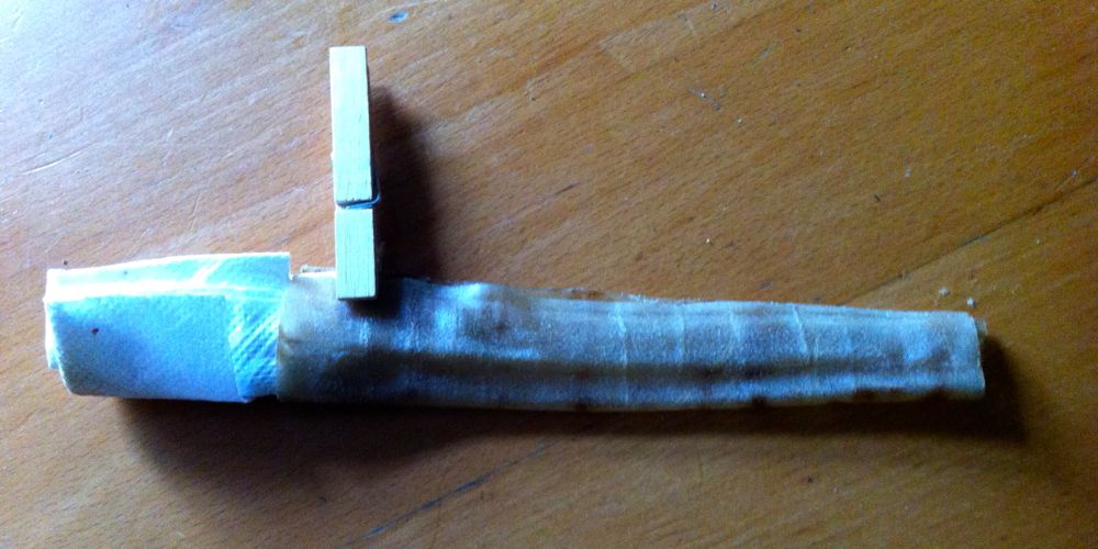 Als erstes wird der Knochen in Wasser eingeweicht. Das dauert einige Stunden aber danach lässte sich die Haut wie Leder bearbeiten. Nur beim schneiden sollte man ein sehr scharfes Messer, Schere oder noch besser ein Skalpell haben. Ich habe das meiste mit der Schere geschnitten. Nach dem aufweichen und grob zuschneiden (Achtung, die Haut schrumpft ein klein wenig beim trocknen) wird sie an die Klinge angeformt und festgemacht. Ich verwende dafür Gummiringe, Wäscheklammern oder wie in dem Fall diese Klammer wie man sie im Bürobedarf kriegt.