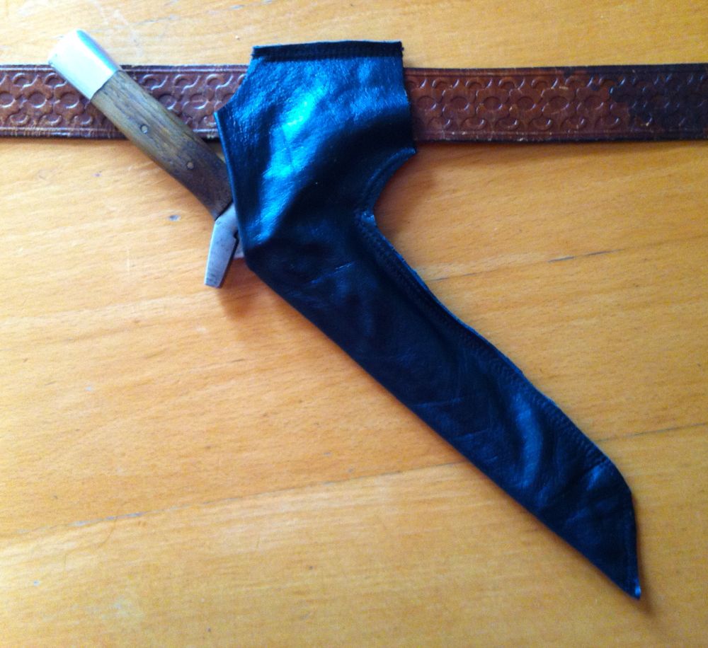 Das Grundpinzip meiner Scheide stammt vom Hüftköcher in dem die Pfeile in einem kurzem Köcher stecken und nach schräg hinten hinausstehen.
