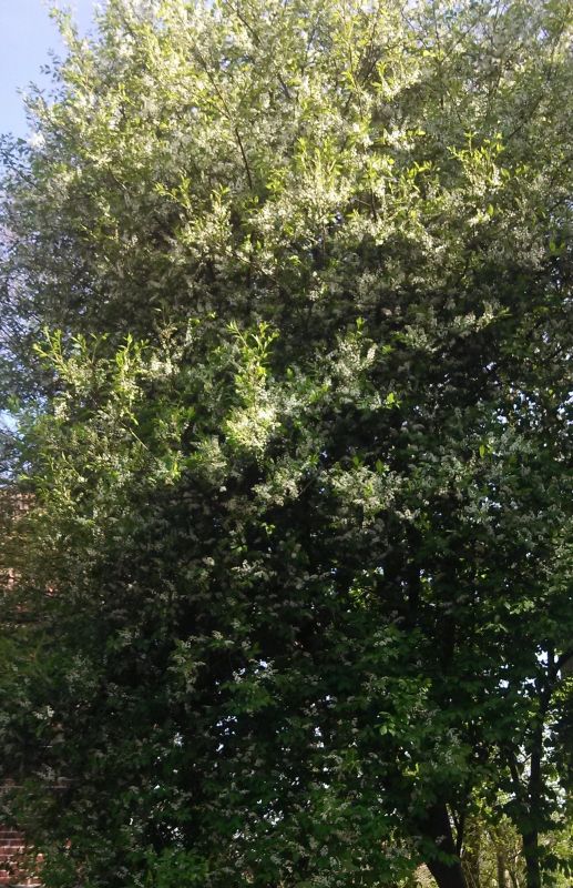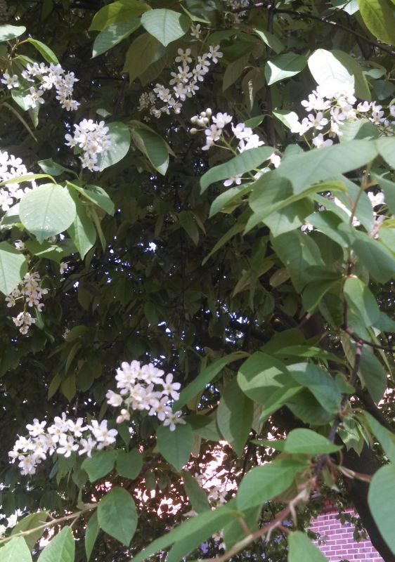 Sieht fast so aus wie die Traubenkirsche in meinem Garten. Nur sind da die Blüten in Dolden angeordnet, die senkrecht zum Ast stehen.