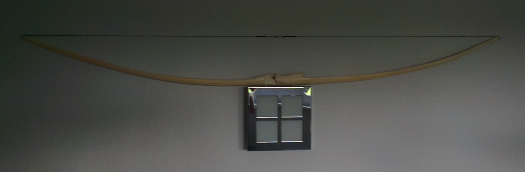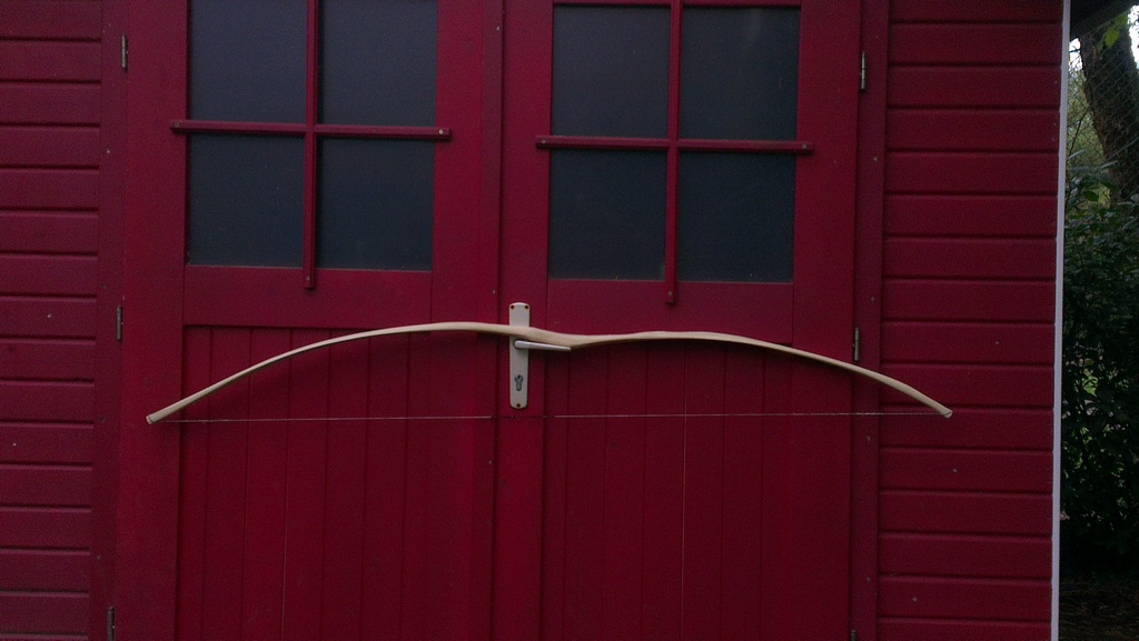 Getillert wurde über der Brust, der Tillerstock ist nur fürs Foto. Trotz einer deflexen/reflexen Stelle im Wurfarm biegt er schon recht gleichmäßig. Die Stelle will ich aber noch korrigieren.