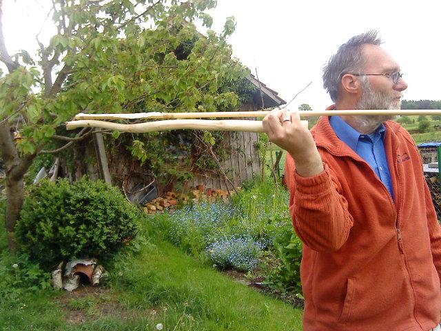 - 2,4m lange, 1,5cm dicke und gerade Kiefernstange aus dem Baumarkt