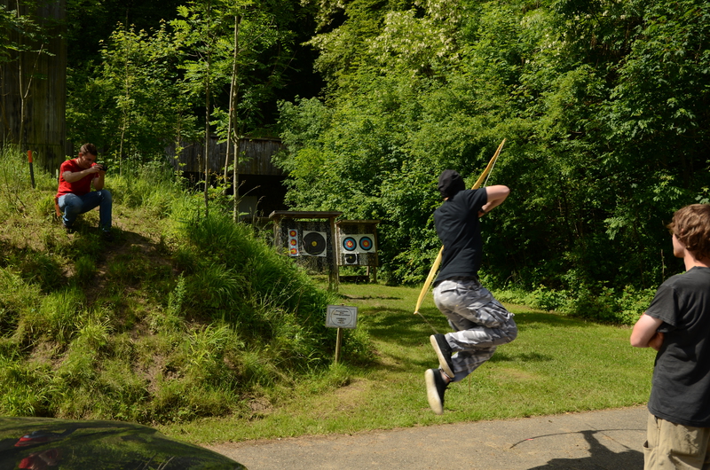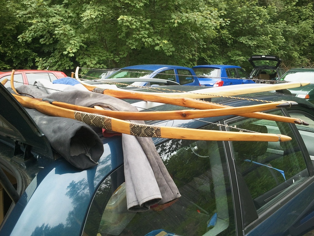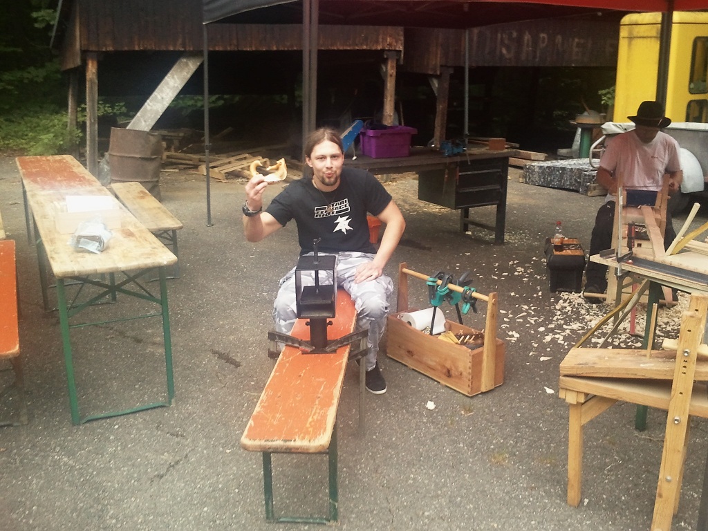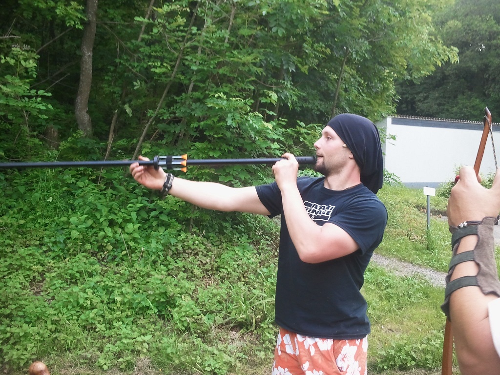 In Reutlingen wurde schon kräftig gearbeitet. Robinie Jörg schärft verschiedene Beile und Selfbower ist mit Zeitlupenaufnahmen beschäftigt, zum Beispiel vom fliegenden Haithabu. Der Bogen von unserem Schreiner Neugier verdeutlicht, was «schnurgerade» bedeutet (man betrachte die Sehne): Das Gelände liegt mitten im Wald, hier von einem Schiessstand aus gesehen. Da übt auch der Nachwuchs fleissig: und dazwischen wird auch, man glaubts kaum, Bogen gebaut, hier im Bild alfred33. Silberwolkes Osage vom letzten SDBT ist wieder auf dem Tillerstock, auf dem Bild Silberwolke und Karlo. Neugier baut für den Robinienbogen von Robinie Jörg eine Sehne. Der Bogen ist auf Bild 7648 zu sehen und schiesst sich so gut, wie er aussieht! Archerbald, unser Mann für die Rittersport-Schokolade, schneidet Selfnocks ein. Das Aluteil hält den Schaft mittig.