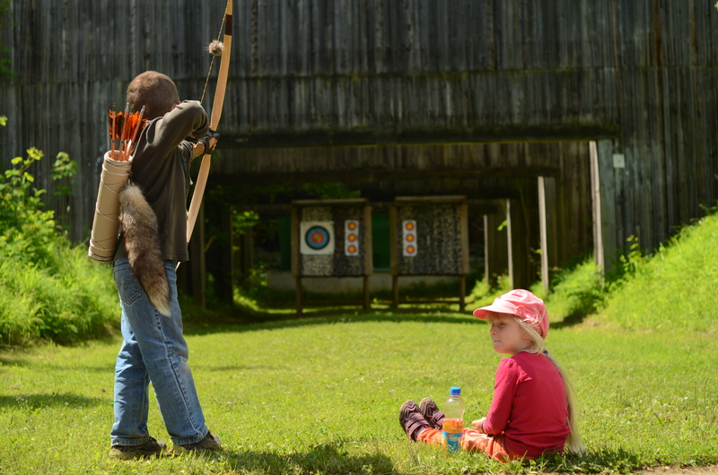 Unterdessen ist schon fast die ganze Truppe abgereist und Haus und Platz gefegt. Silberwolke möchte noch seinen Goldregen gegen Osage tauschen, bis dann dauert es aber noch zwei Stunden. Auf dem Parcours bringt er Sisterskin das Bogenschiessen bei.