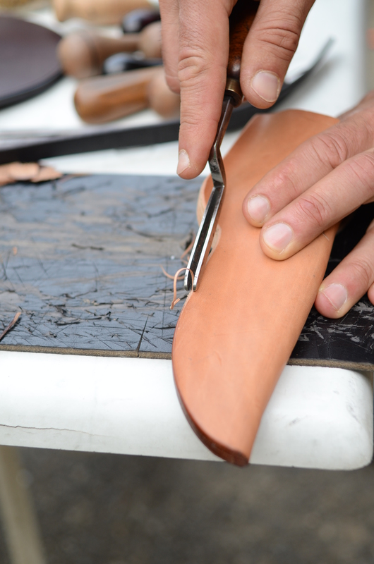 Mit einer Ahle kann der Narben in der Kerbe dan aufgeschnitten (wenn ich das richtig gesehen habe) und mit einem Falzbein aufgeweitet werden. Nach dem Nähen wird der Narben durch Reiben mit dem Falzbein wieder geschlossen. Im Bild ist das der Schnitt ganz links.