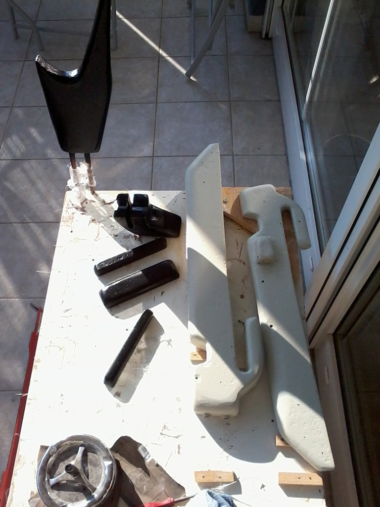 GFK wurde aufgetragen und verschliffen, GFK-Haftgrund wurde lackiert,Füller aufgetragen und verschliffen und teilweise ist auch schon die schwarze Grundierung für das Dry-Paint drauf.