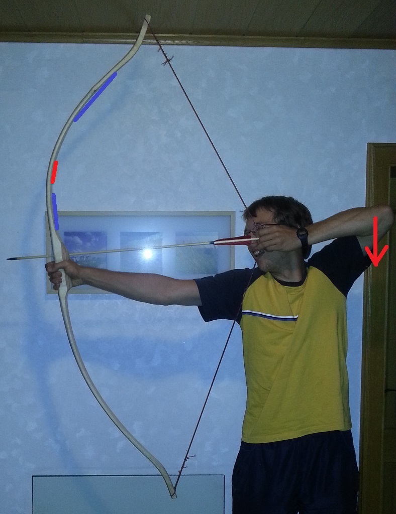 und der Bogen dadurch von unten gedrückt ist. Bogenhand, Schultern und der Ellbogen des