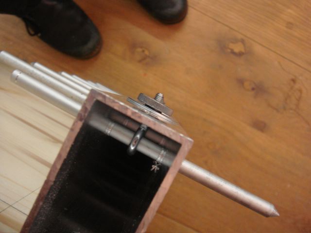 Schaftaufnahme - Exzenter(artige)Klemmung... Stift geht durch das Aluprofil (Holz geht auch), von oben hängt man durch ein Loch eine Ringschraube ins Profil. Spannt man die Mutter oben an zieht es den Stift hoch und er klemmt fest...