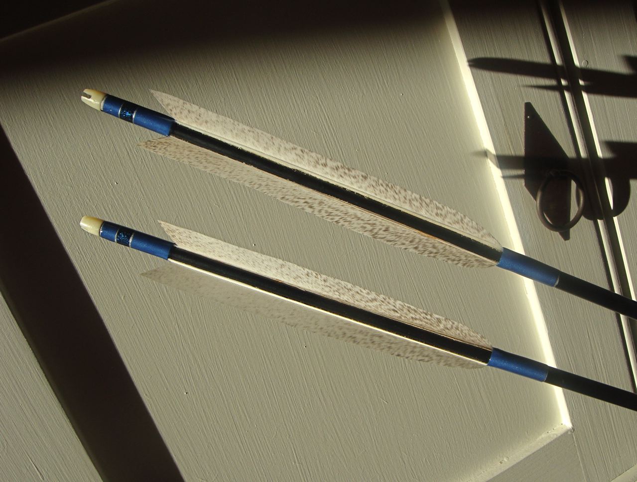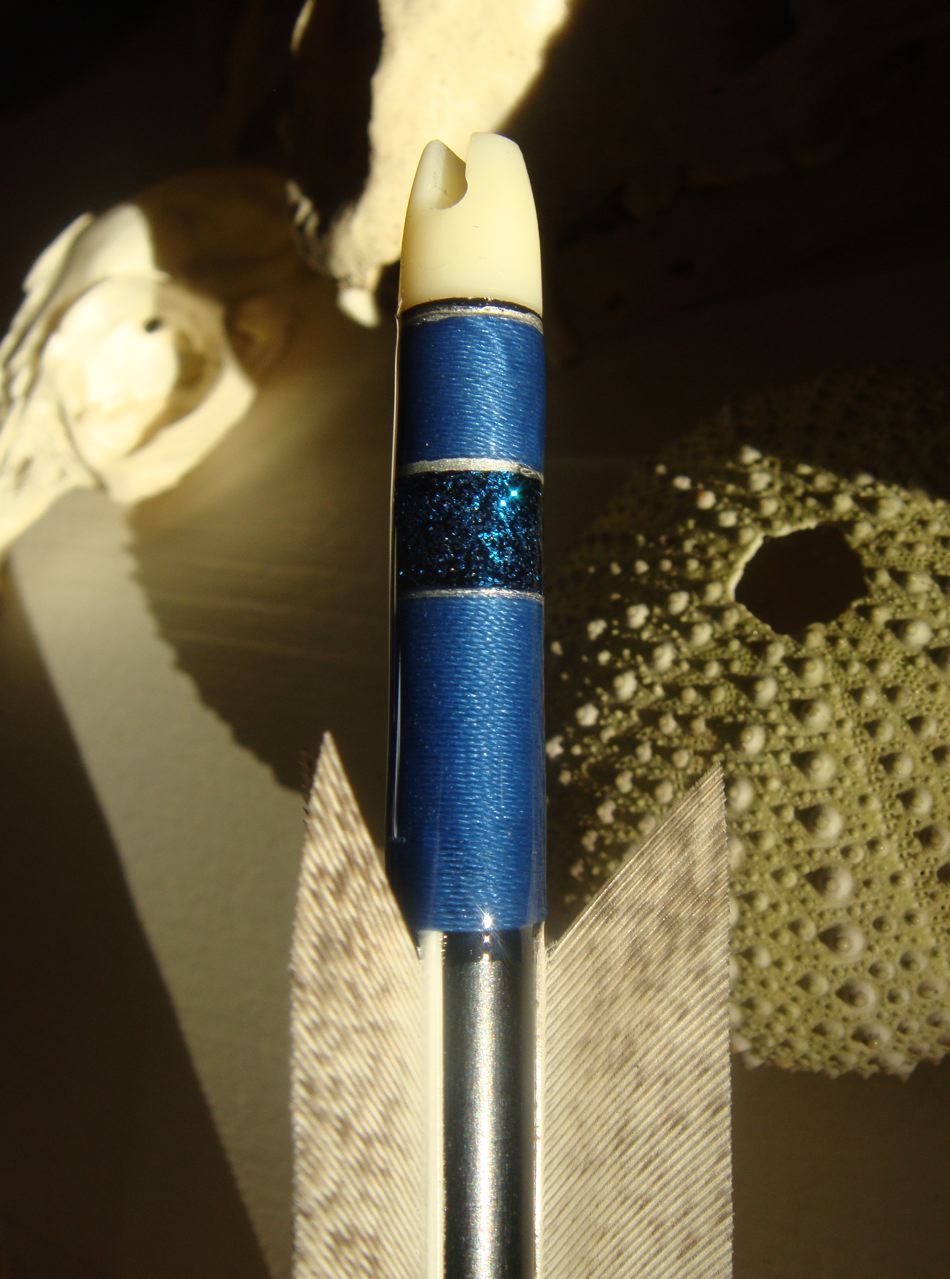 Die Pfeile, die ich von Gervase geschenkt bekommen habe, hatten zu Anfang die Nock europäisch aufsitzen. Nachdem ich eine Weile mit den Pfeilen geschossen hatte ging es mir ziemlich auf den Keks, dass ich mir dabei die Leitfeder platt drückte. Also habe ich die Nocks runter gemacht und neue, mit der Leitfeder nach oben, drauf geklebt.