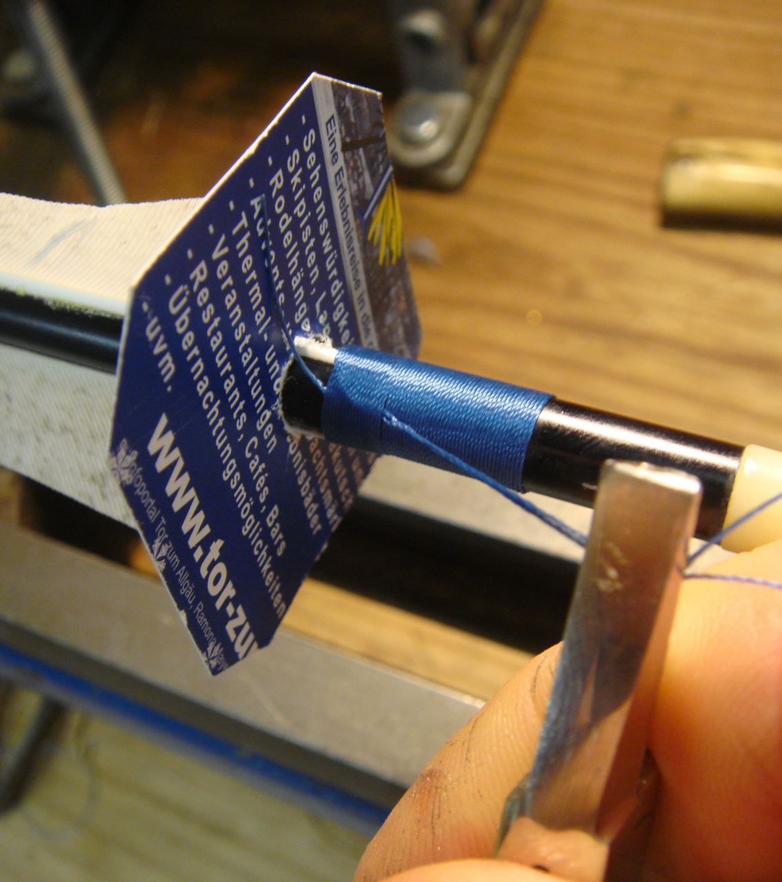 Ich habe versucht Bilder zum Wickeln zu machen... mangels Hände nicht sehr aufschlussreich... :-\ ... aber es gibt ja Youtube und da gibt es Rutenbau-Clips die zeigen Wickeln und Lackieren in gross (Rods mit 40mm Durchmesser... da sieht man wenigstens was :o )
