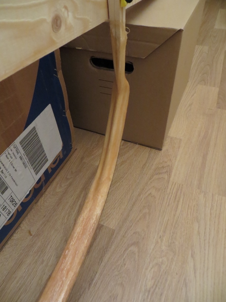 Das Gewicht des trockenen Sehnenmaterials zusammen mit dem hierfür notwendigen trockenen (!) Klebergranulat soll dann die Hälfte des Gewichts des noch nicht mit Sehnen belegten Bogens betragen.