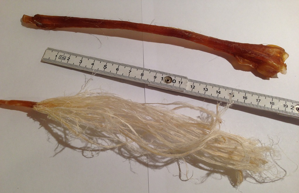 die längsten sehnenfasern waren 20-25 cm, von diesen hatte es aber nicht sehr viele dabei. Der grösste Anteil bestand aus ca. 15cm langen Fasern. Die Sehnenfasern habe ich im Wasserbad eingelegt und dann feucht verarbeitet. Der Wurfarm war aufgerauht und entfettet (der hat ja offenbar nicht delaminiert...)