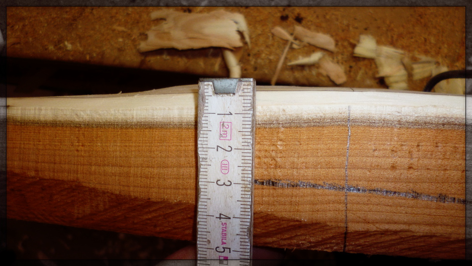 Mitte Stave markieren, dann überlegen wo oben und unten sein soll, demnach 70mm nach UNTEN und 30mm nach OBEN anzeichnen. Das wird der 'Festhaltebereich'. Von diesem Bereich wieder 155mm anzeichnen. Jeweils an den oberen wie auch an den unteren Wurfarm. Das hält den Bogen nachher kräftig im Mittenbereich und verhindert übermäßige Biegung in Bogenmitte.