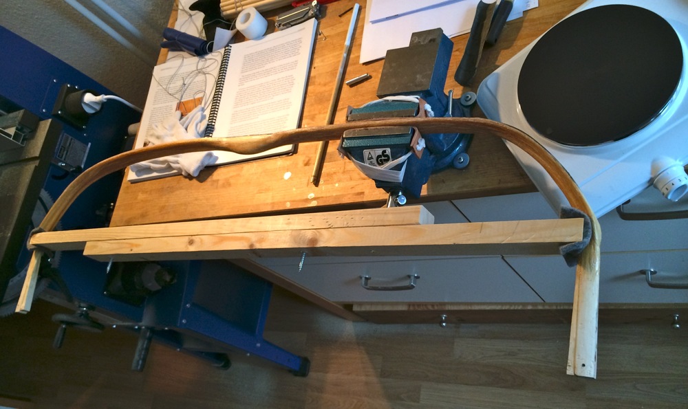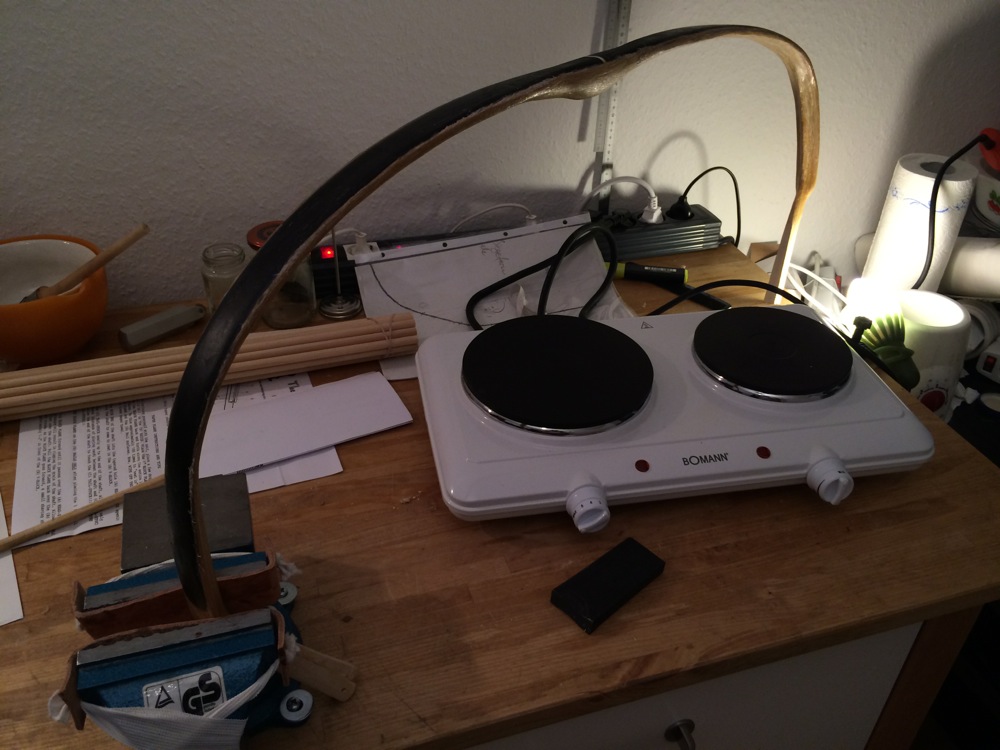 Aber so ganz happy bin ich noch nicht. Bei dem einen Wurfarm habe ich das Gefühl, dass die Oberfläche des Horns irgendwie schräg ist, also nicht genau senkrecht zur Biege-Ebene. Wenn das stimmt, dann hätte ich irgendetwas Gröberes falsch gemacht. Vlt zu unterschiedlich die Seiten der Wurfarme mit Sehnen belegt, so dass sich in die Wurfarme eine leichte Spirale reingezogen hat? Na ja. Ich will mir jetzt Zeit lassen und genau überlegen, was da los ist.