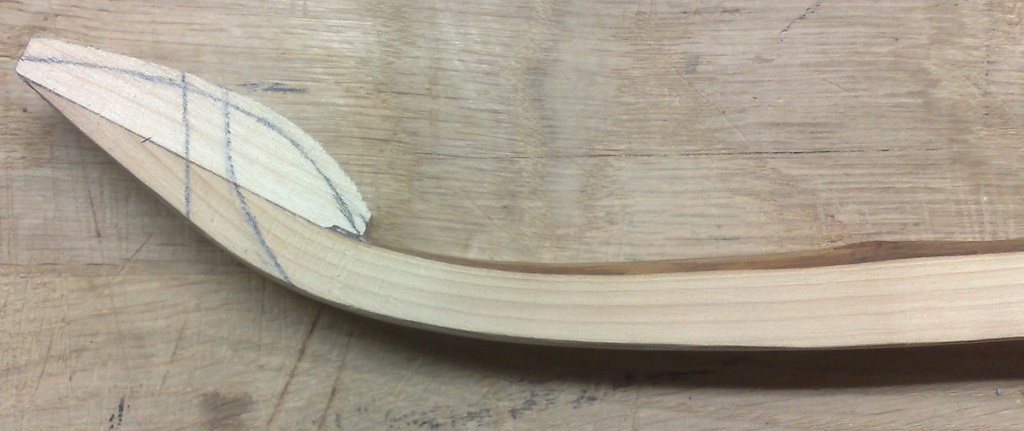 Ich habe eine Position für die Sehnen-Kerbe mal eingezeichnet und bin nicht ganz sicher, ob das so gut ist. Bitte nicht an der kleinen Stufe Richtung Bogenmitte stören: Damit hat es auf sich, dass mir nach dem abschneiden des Endes die Überlappung zwischen Overlay und Bogen (gemeint ist der Rückenring) so minimal erschien, dass ich hier schwere Bedenken hatte, dass das Overlay den Rückenring wirklich sichern kann.