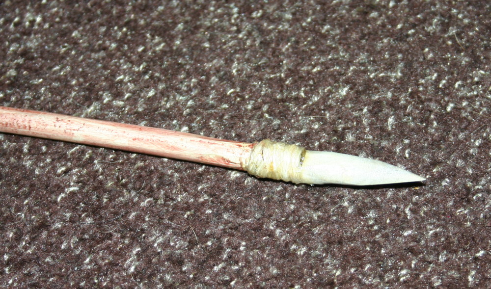 Die Spitzen aus Knochen, Geweih und Stein wurden mit Straußensehne gewickelt und mit Knochenleim gesichert. Danach habe ich die Federn (2 x Taube, 1 x Krähe) mit Birkenpech geklebt. Das war vielleicht eine Sch...arbeit. Das Schwierige daran ist, das Birkenpech zum Schmelzen zu bringen ohne die Federn zu verbrennen oder die Finger zu sieden. Vorsichtig mit der HLP hats dann einigermaßen geklappt. Die Federn habe ich dann mit Hirschsehnen gewickelt und mit Knochenleim gesichert. Nochwicklung ebenso. Abschließend habe ich die Pfeile mit einer Mischung aus farbloser Schuhcreme und pulverisierter rotbrauner Kreide gewachst. (hatte leider kein Original Rötel, was noch besser zur Steinzeit gepaßt hätte
