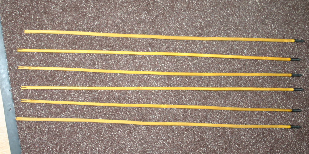 Und es geht weiter: Nachdem alle Pfeile bespitzt und benockt waren, hab ich mich der Befiederung gewidmet. Mir ist übrigens beim Nach-/Feinrichten einer der Schmetterlingsstrauchschößlinge angeknackst, so daß ich nur noch 6 Pfeile präsentieren werde. Naja, macht nix. Hier ist das Ergebnis meiner Schaftverjüngungen, alles in Handarbeit mit der Ziehklinge: