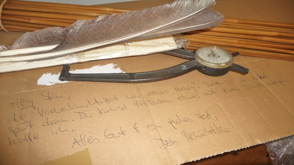 Ich hatte ja schon die Schüttelsünde begangen... dabei hörte ich ein pling und ein pompf. Das pompf war keine junge Dame, sondern eindeutig ein paar hölzerne Gegenstände, und das pling ... klang sowas von nach Pfeilspitze für Holzpfeile, dass sich diese Assoziation nicht durch den ... naja ... eindeutigen ... 10x10x100cm Karton zerstreuen ließ. Beim auspacken blieb mir dann die Spucke weg. 9 knuffige Holzdübelchen ein paar Plastikverhüterli für das eine, und eben die Blechstöpsel für die andere Seite ... und ... FEDERN wie doof! Je weiter man das alles betrachtete, desto besser wurde es ... Grade faserverlauf, gutes Schaftgewicht, schöne Federfarben ... gut geschliffene Kiele ... und die ultimativen Pfeilnocken, wie keiner weiß lassen sich nur die Roten an meine Kälberstrangsehnen anpassen ... hier MUSS einfach ein Könner am Werk gewesen sein, daher bleibt eh nur Inopel in der Auswahl! glaubich