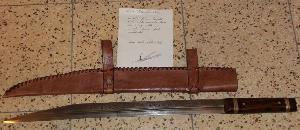 So wie ich das sehe ist es ein schöner "Deko" Sax mit so etwas Ähnlichen wie geätzten Runen. Also etwas mehr nach Wikinger Mode als nach sächsischer Richtung, aber ich freue mich dennoch riesig.