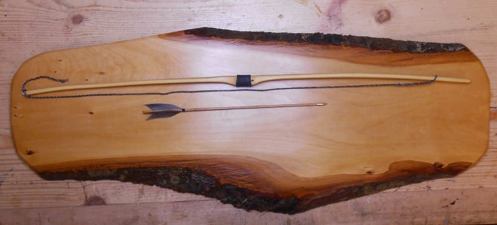 Holunder-Zwerg 24" 6# bei 9" Auszug mit Pfeil auf einem Brett zum an die Wand bummeln. Der Bogen kann zwar geschossen werden, ist aber eigentlich nur als Deko gedacht.