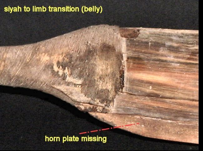 Nachdem ich ihm einige Lagen Sehne verpasst habe, den Bauch getempert habe und schließlich sogar mit Flachsfasern am Bauch rumexperimentiert habe, hat sich keine befriedigende Verbesserung eingestellt. Der Plan ist jetzt, in aller Ruhe die Hörner plan zu schleifen, mit Hautleim auf den Bauch zu kleben und 3-6 Monate zu trocknen, bevor er wieder gespannt wird. Also Mitte bis Ende 2014 gibt's hier was neues.