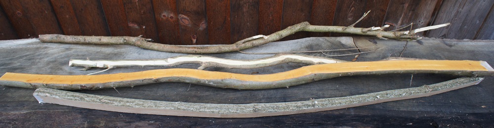 Angefangen hat es damit dass ein ehemaliger Mitarbeiter an Weihnachten in der Werkstatt vorbeigeschaut hat. Nebenher meinte er Ich hab Dir ein paar Stöcke mitgebracht vielleicht kannst Du ja einen Bogen draus bauen. Zuerst dachte ich der hat ja Vorstellungen bis mir klar wurde das sind zwei Flieder und ein Holunder. Na dann kann ich es ja mal probieren.
