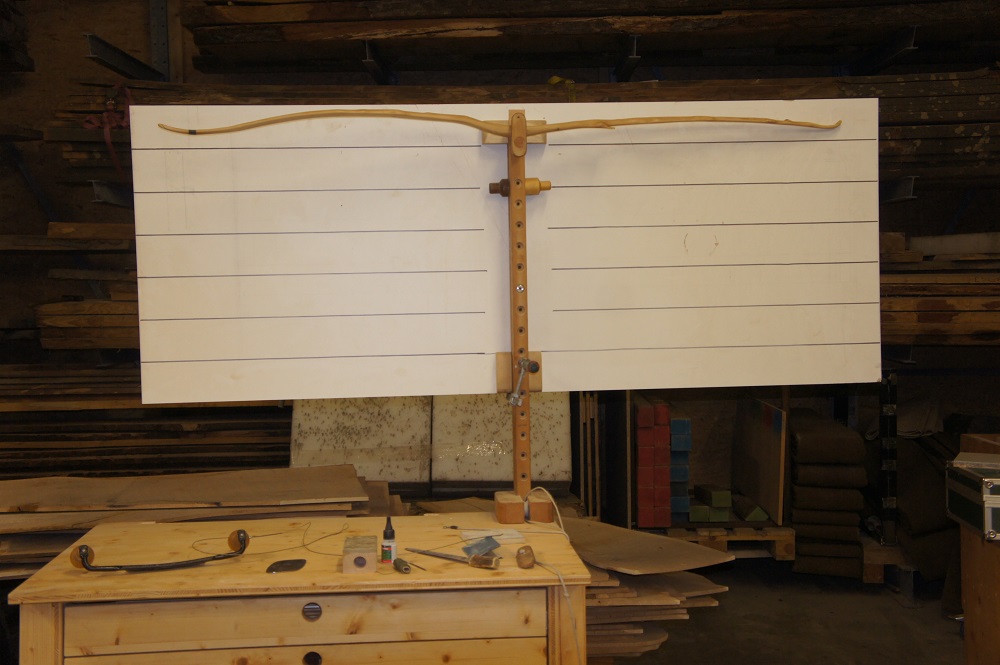 Damit ich den Bogen ausrichten kann habe ich in einen Balken zwei Nägel reingeschlagen. So konnte ich besser erkennen ob die Fläche vom Bauch richtig ausgerichtet ist. Jetzt habe ich einige Stunden geschliffen geraspelt und getillert.