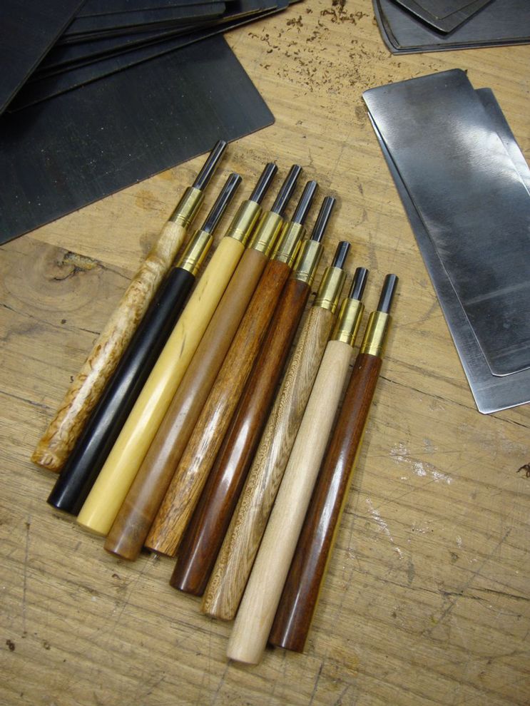 Griffe sind gedrechselt mit Messing Zwinge. Hölzer sind ein paar Tropische dabei... Ebenholz, Merbau,... nochwas wo ich den Namen nicht weiss... und von daheim... Ulme, Bux, Birke, Birne, Ahorn.