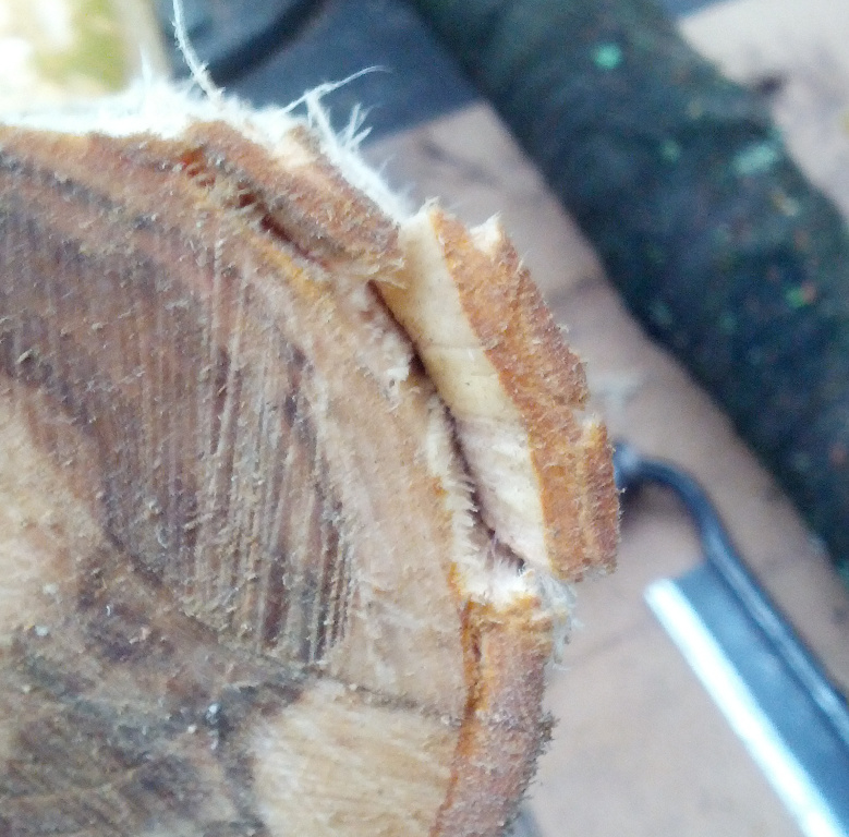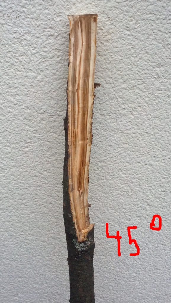 Habe versucht das Kirschenstämmchen zu spalten. Das war wohl nichts. Ich glaube ich habe den viel erwähnten Drehwuchs gefunden.