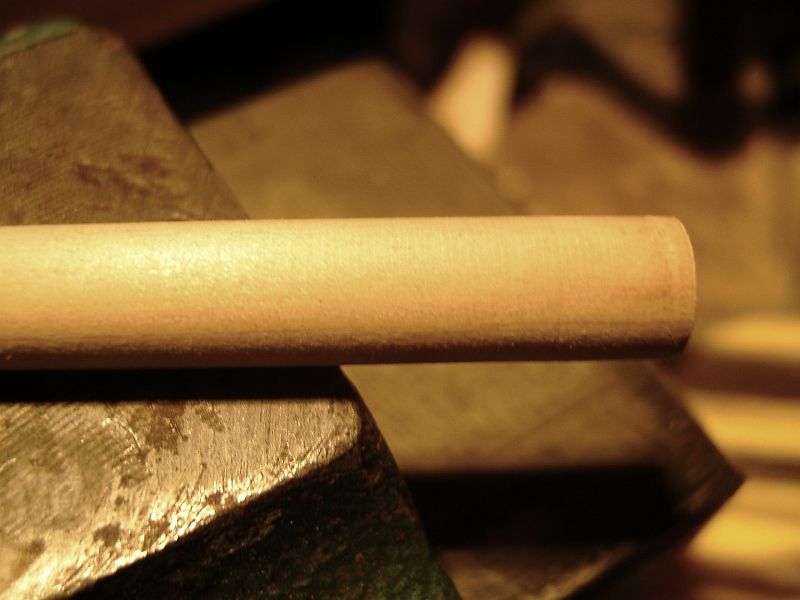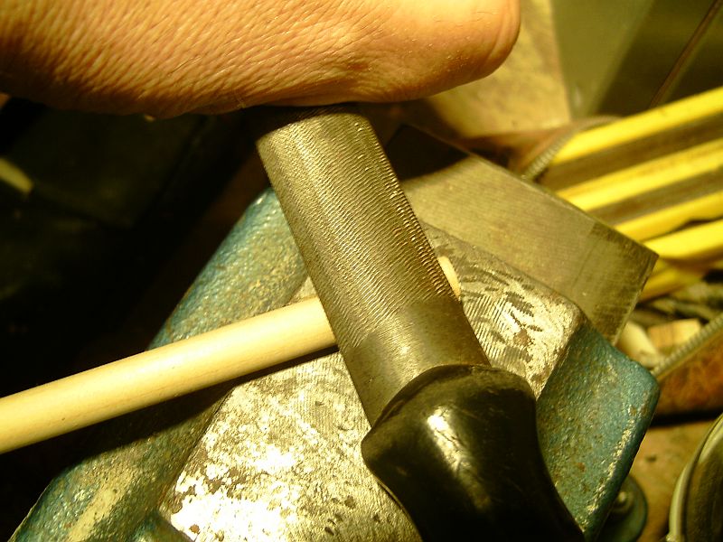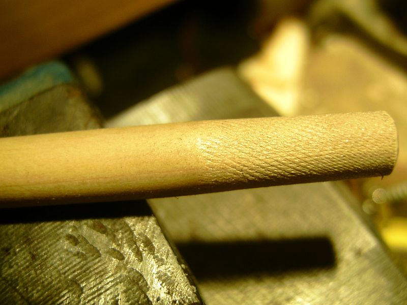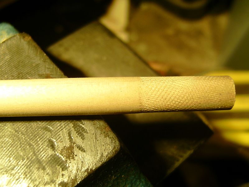 Das Rollen mit der Feile hat einen interessanten Nebeneffekt: Das Holz bekommt ein "Waffelmuster". Das verbessert die Haltbarkeit, besonders mit einem zusätzlichen Tropfen Pattex...