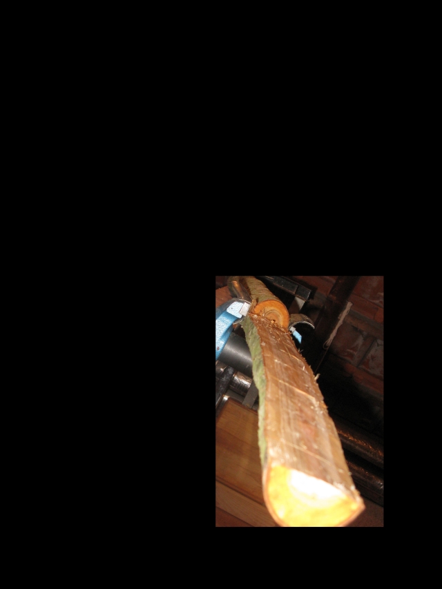 Leider nur ein Foto in der Werkstatt und schon in Bearbeitung: Eingesägt und abgeklopft und abgehobelt... Glattmachen... Rinde ab und dann Bast ab... Glitschnass und trotzdem musste abgezeichnet werden: Dann habe ich die Bogenform dank des nassen Holzes in Kürze hingehobelt und abschliessend bodengetillert.