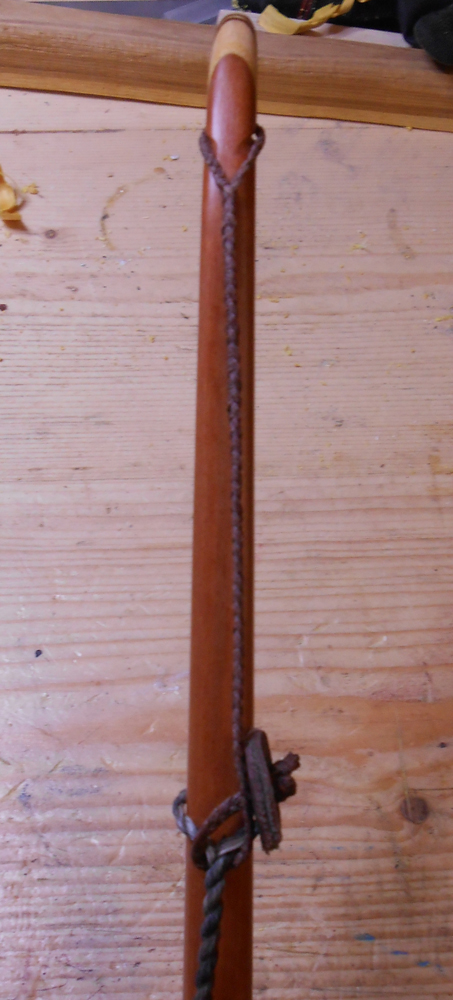 die Sucherei "wo ist jetzt wieder die Sehne zum Bogen" hat genervt, daher hab ich mir einen einfachen Sehenenhalter gebastelt. Nähen von Leder ist nicht meine Stärke, daher: in der Bucht 3mm Gummischnur gekauft (10m reichen für ein paar Halter..), ein Lederrestchen mit der Lochzange bearbeitet, ein Eibenästchen schräg abgesägt, Loch gebohrt, Gummischnur durchgefädelt, Knoten rein, fertig. Quick and not completly dirty ;)