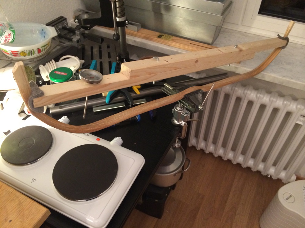 Nach meiner Erfahrung ist beides wichtig,um vertörnte Bögen dauerhaft zu korrigieren.Viele arbeiten ja mit Keilen,ich mach' es so,dass ich auf meine Arbeitsplatte noch eine zweite Platte lege,die mind.25mm stark und mind. so lang und breit wie der Bogen im entspannten Zustand ist. Auf dieser zweiten Platte fixiere ich dann den Bogen mit Zwingen und zwar so, dass der Teil des WAs vor dem Twist noch aufliegt und genau da fixiert wird.Der verdrehte Teil,also das Ende des Wurfarms, muss über die obere Platte hinausragen und nach oben(von der Platte weg)zeigen.Ich erwärme den Hornteil der verdrehten Stelle dann vorsichtig mit der HLP,(man muss ständig nachfühlen dh.,das Horn darf nicht so heiss werden,dass man es nicht mehr anfassen kann)und nach ca.3 min biege ich den WA über die Kante der oberen Platte ,je nach Stärke des Twists bis auf die untere Platte und zwinge ihn dort fest. Also über 25mm Überstreckung im Maximalfall!( Ein gut geklebter Komposit macht unter Wärmeeinfluss schon irre Gegenbiegungen mit,aber es sollte immer moderat sein!)Bereits nach 15 min,wenn das Horn erkaltet ist,löse ich den Bogen aus seiner Zwangshaltung und biege per Hand evtl. wieder etwas zurück.Ich mag einfach dieses 'auf Tuchfühlung gehen' mit den Kompos,das ist echte sinnliche Erfahrung!