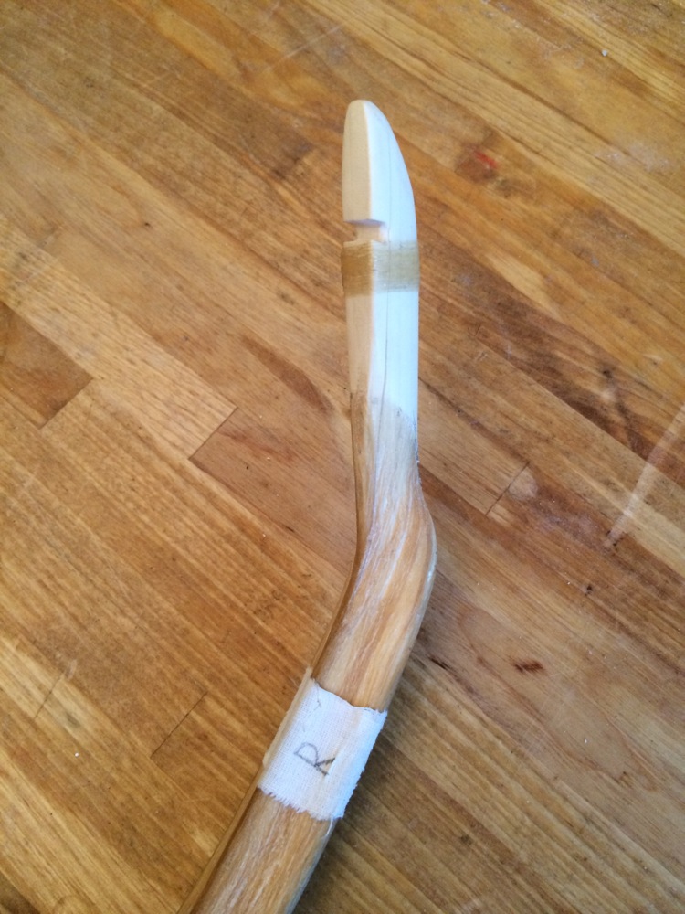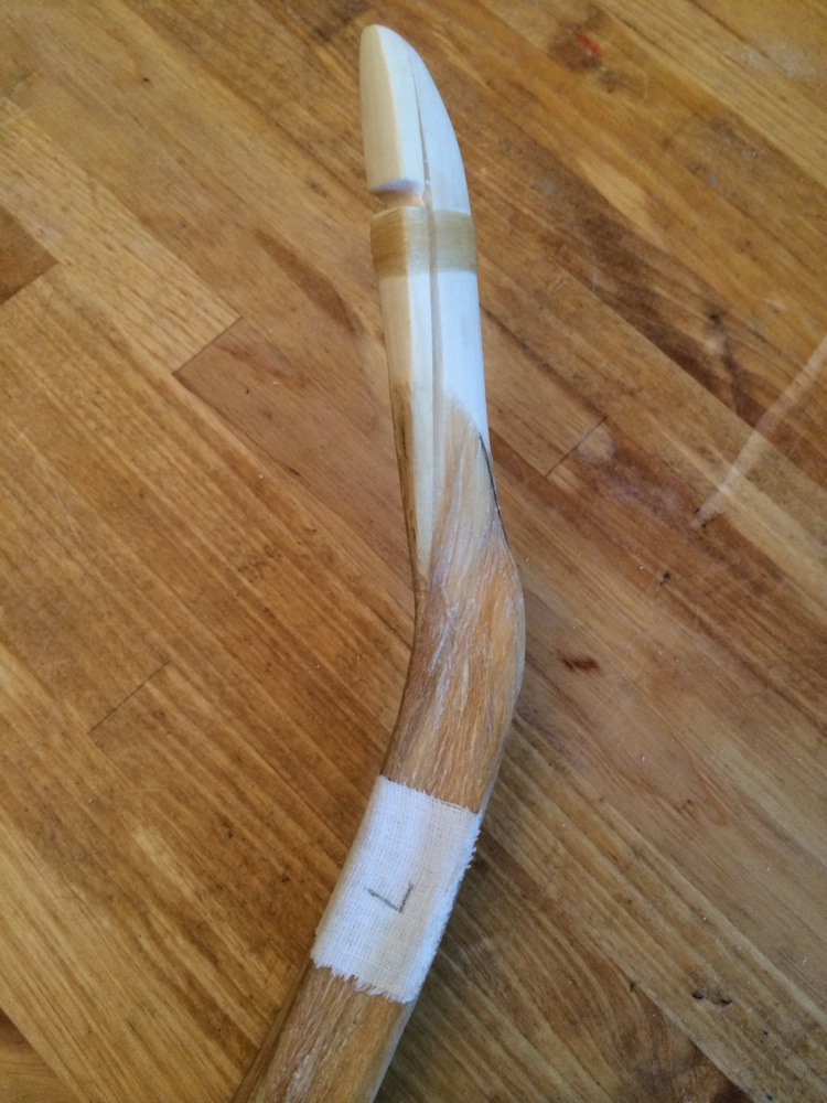 Mittlerweile habe ich mit den Korrekturen aufgehört, denn beim anschließenden Ausziehen zeigte sich eine erste Stelle, an der sich die Sehnenschicht leicht abgelöst hat. Siehe weißliche Spur inklusive Riss. Hier das Operationsbesteck: Habe die Stelle mit heißem, etwas dünnerem Hautleim unterspritzt und ein Stück harten Schaumstoff mit Theraband auf Zug gewickelt. Ich wollte ursprünglich die Klammern einsetzen, aber die rutschten an diesem Teil des Bogens ab. Hier das Ergebnis: Wie man sieht, hat sich eine längliche Vertiefung gebildet - kann mir das nur so erklären, dass da schon länger ein Hohlraum drunter war und die Sehnen erst jetzt an dieser Stelle ordentlich auf dem Holz aufliegen.